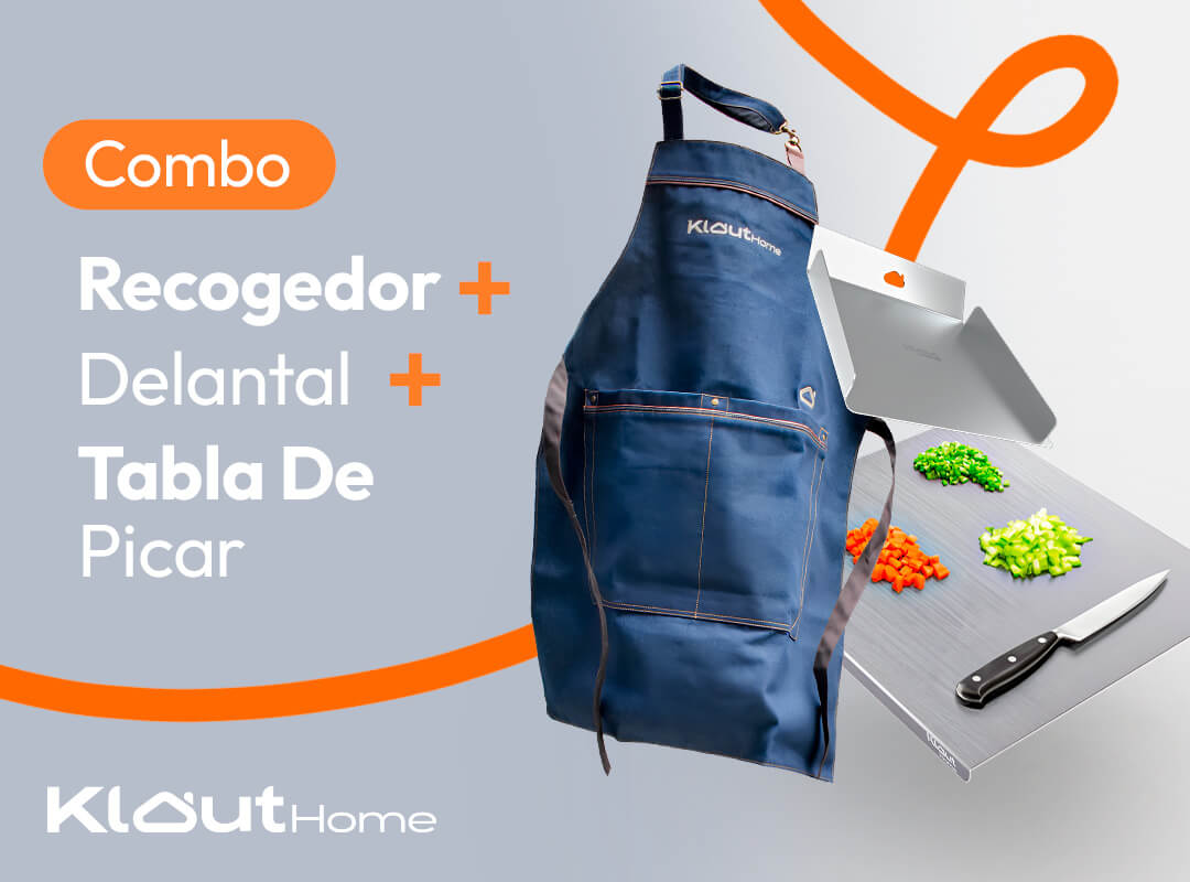Recibes tres piezas: una tabla de acero inoxidable 304 de 48 × 38 cm, un recogedor a juego de 15 × 15 cm y un delantal de jean premium con dos bolsillos grandes.