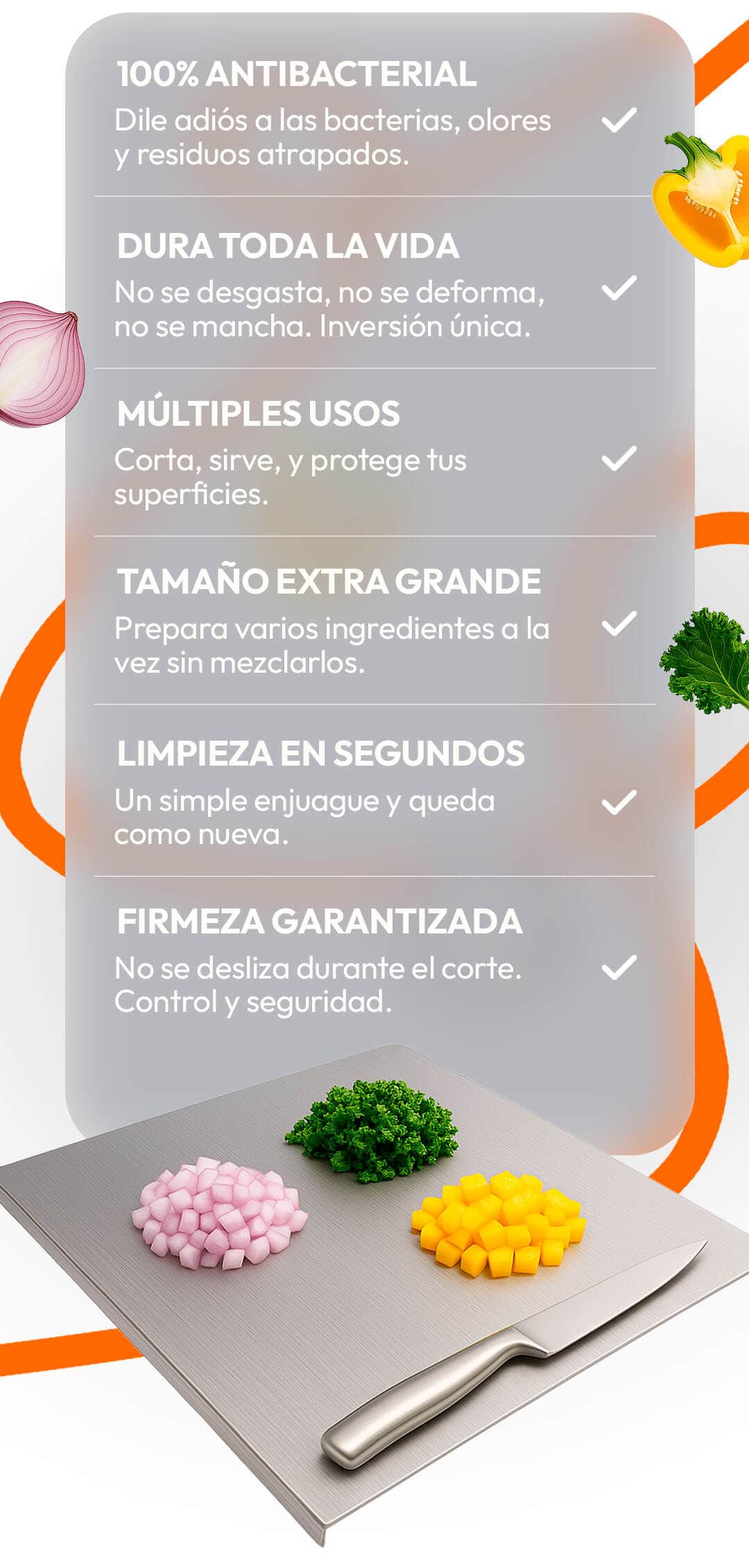 Desde carnes y pescados (donde su superficie antibacterial brilla) hasta frutas, verduras y hierbas.
